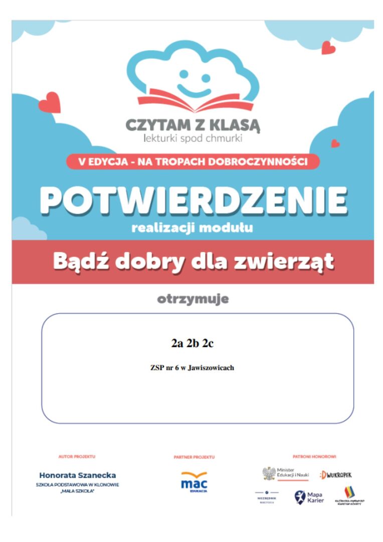Uczniowie klas 2 zrealizowali zadania z II modułu projektu czytelniczego, którego tym razem hasłem przewodnim było "Bądź dobry dla zwierząt". Oczywiście bohaterami lektur, które zostały wybrane do przeczytania były zwierzęta. Najpierw uczniowie zapoznali się z przygodami niesfornego kota czytając lekturę "Cukierku, ty łobuzie". Następnie podążali śladami podróży Doktora Dolittle i jego zwierząt. Na końcu dodarli do najzimniejszego kontynentu świata- Antarktydy, gdzie poznali życie i zwyczaje pingwinów na podstawie książki „Zaczarowana zagroda”. Po omówieniu treści lektur i wykonaniu zadań związanych z realizacją projektu uczniowie poszerzyli swoją wiedzę na temat pracy schronisk i adopcji zwierząt. Rozmawiali o opiece nad swoimi pupilami, dzielili się swoimi spostrzeżeniami i doświadczeniami. Dodatkowo, nie będąc obojętnymi wobec zwierząt, uczniowie włączyli się w szkolną akcję zbiórki karmy dla zwierząt z pobliskiego schroniska oraz zimową porą dokarmiali ptaki ze szkolnego podwórka.